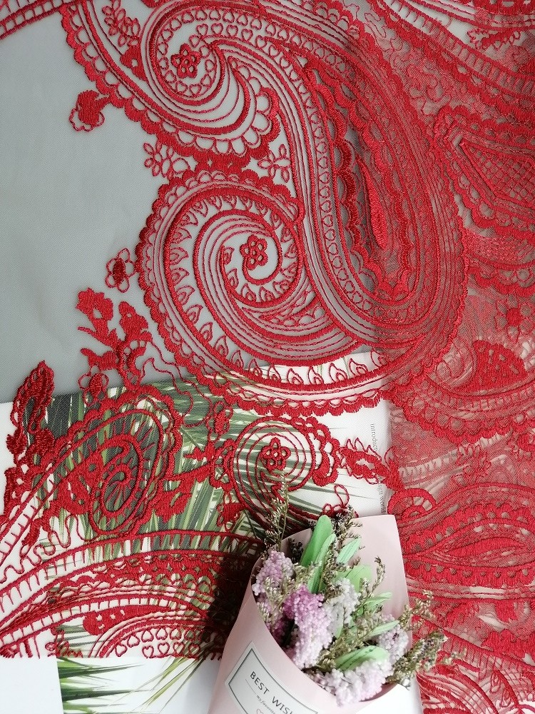 - Czerwona tiulowa siatkowa suknia ślubna Kolorowa haftowana tkanina Paisley Koronkowa tkanina jest odpowiedni dla kobiet, dziewcząt, pań, panny młodej, wesela, imprezy, urodziny i każdą inną okazję.