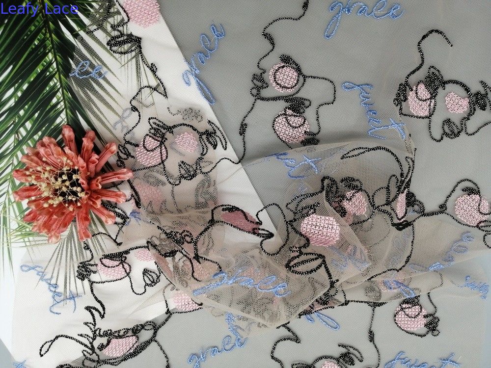 - Wielokolorowa tiulowa haftowana koronkowa tkanina z literami na spódnice marek odzieżowych, sukienki dla małych dziewczynek, tekstylia domowe, zasłony, artykuły pościelowe, odzież, czapki, suknie ślubne, bluzki itp.