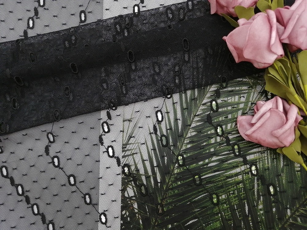 Czarna poliestrowa oczko w kropki Haftowana koronkowa tkanina na suknię wieczorową Sukienka damska Marki odzieży Sukienka dla małej dziewczynki jest przeznaczona do tekstyliów domowych, zasłon, artykułów pościelowych, odzieży, czapek, sukien ślubnych, bluzek, odzieży damskiej, obrusów, sukienek dla małych dziewczynek, modnych butów damskich, Spodnie, spodnie, szorty, kurtki itp.