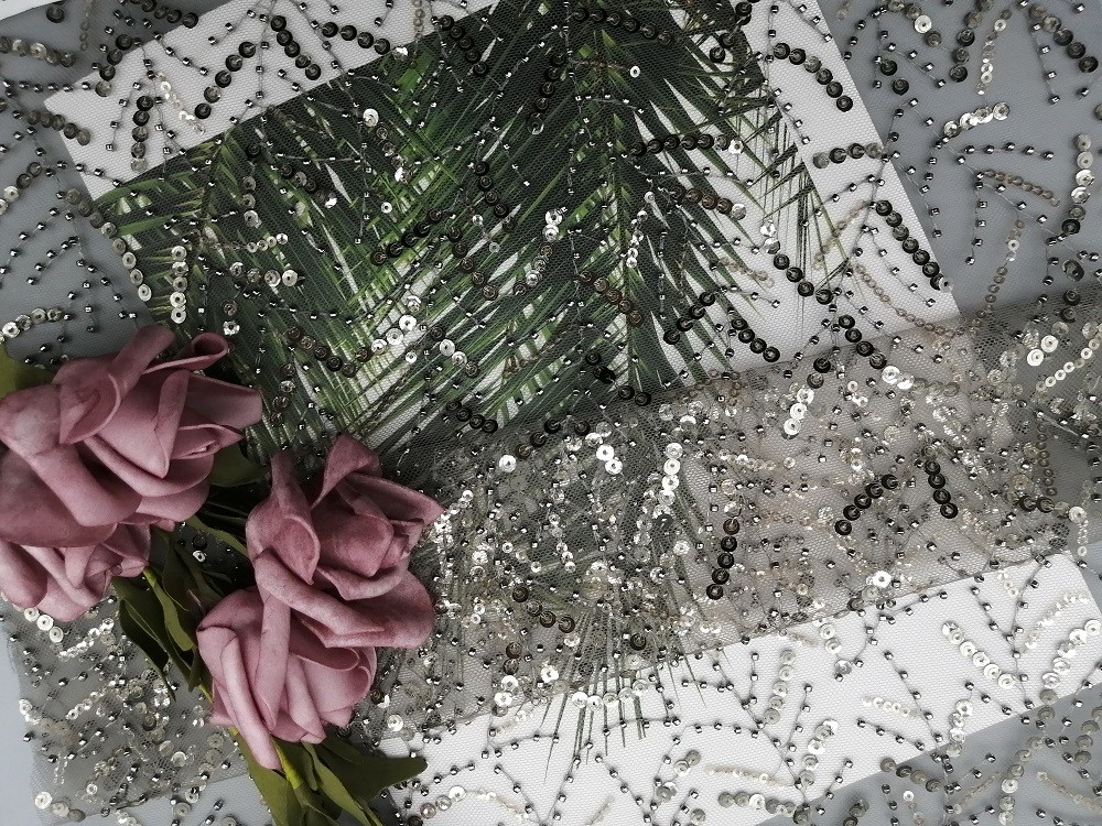 Szary bestseller Cekinowa koronka Tkanina imprezowa Haft z koralikami Tkanina do sukni ślubnej Sukienka damska Dekoracja odzieży może spełniać wymagania OEKO-Tex Standard 100.