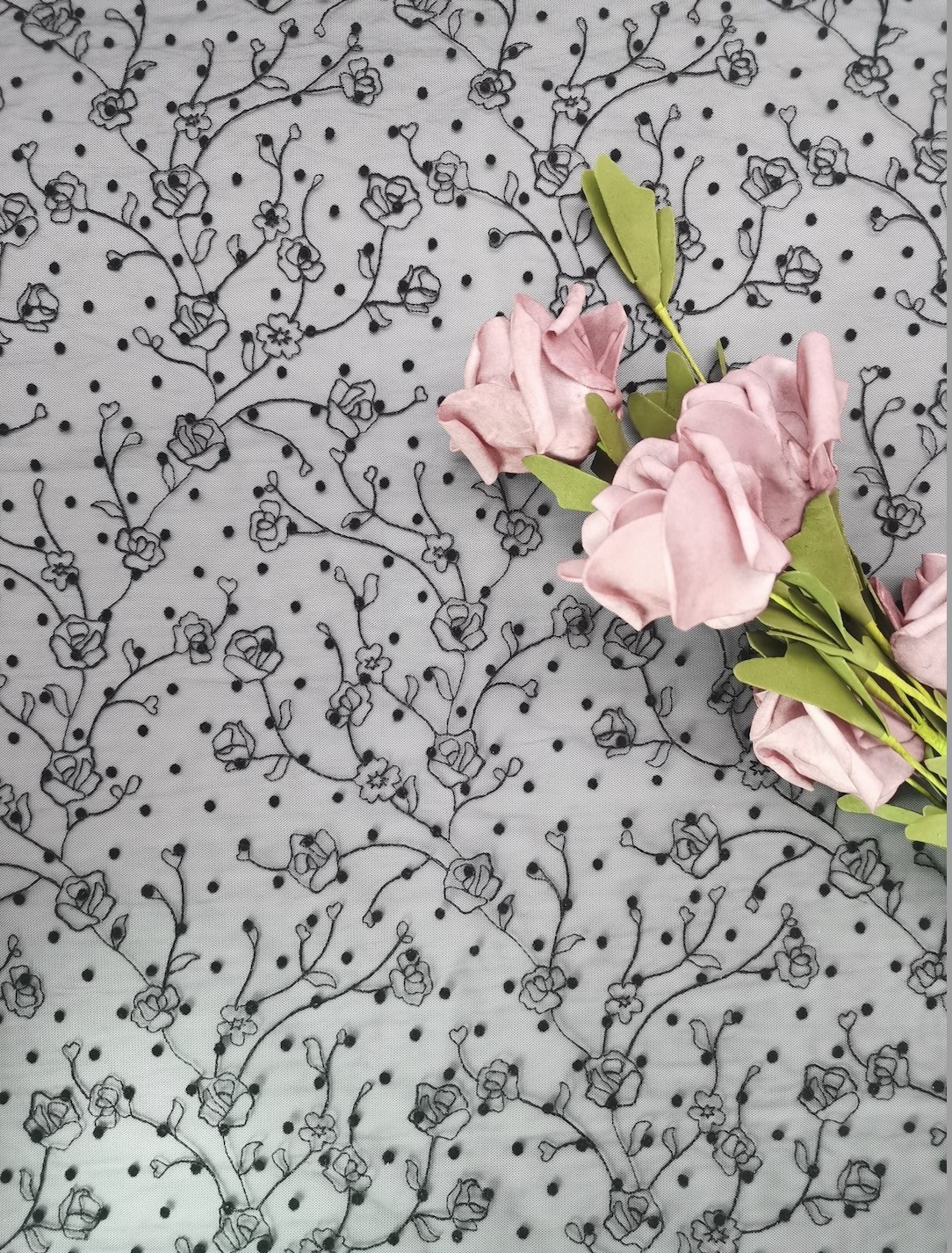 Fantazyjny tiul flokowany koronkowy materiał haftowany materiał w czarny kwiat