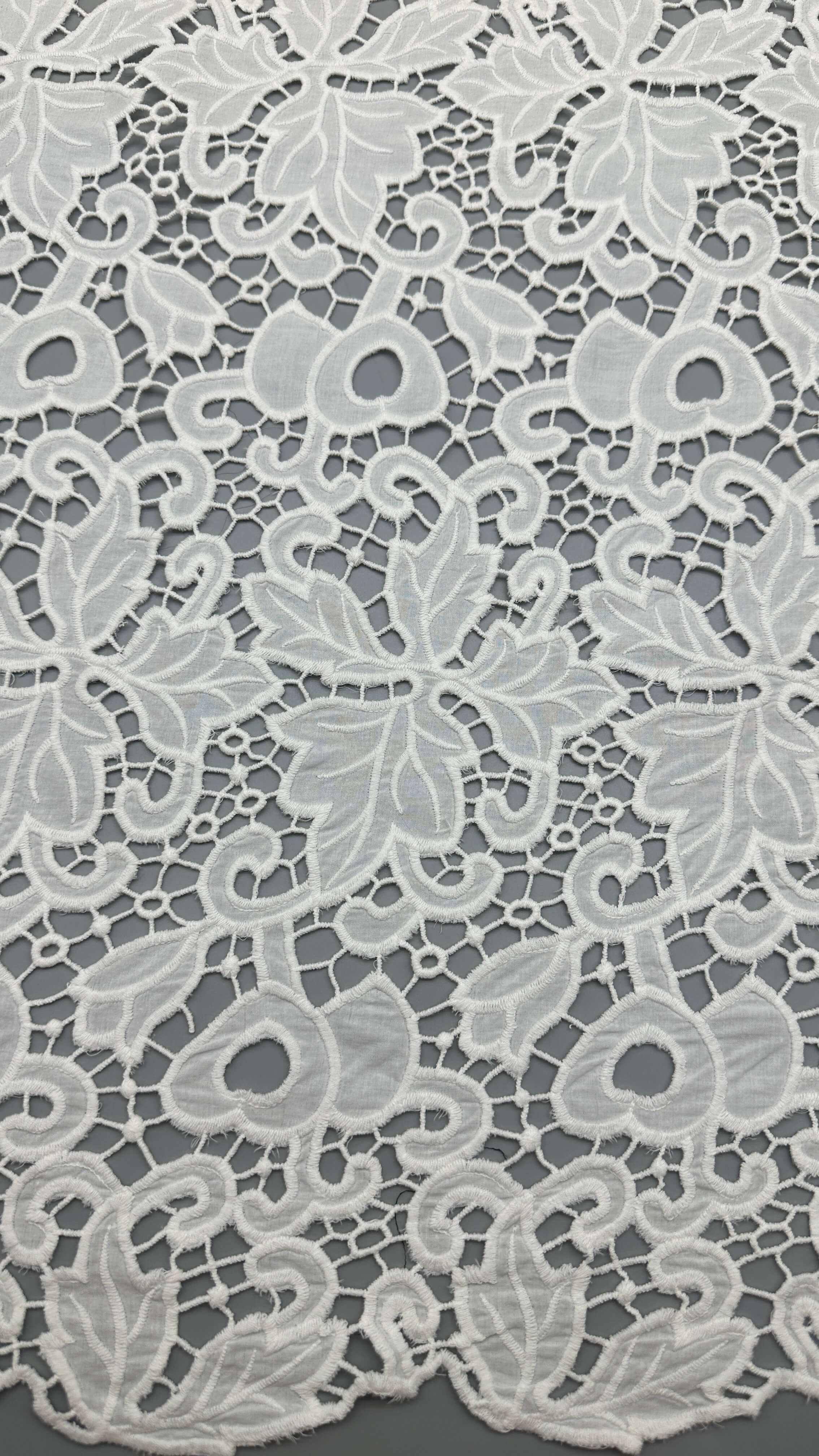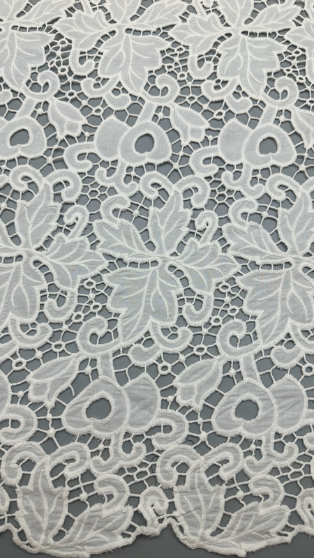 Sztuczka z sztuczkami z delikatnych, liściastych motywów jest popularnym wyborem sukni ślubnych i imprezowych, oferując elegancję, teksturę i skomplikowane szczegóły.Technologia produkcji obejmuje połączenie tradycyjnego rzemiosła i nowoczesnych innowacji tekstylnych.